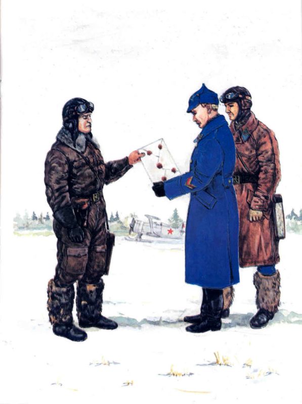 Старший лейтенант в кожаном пальто-реглане, летном шлеме с очками, собачьих унтах и с планшетом через плечо.