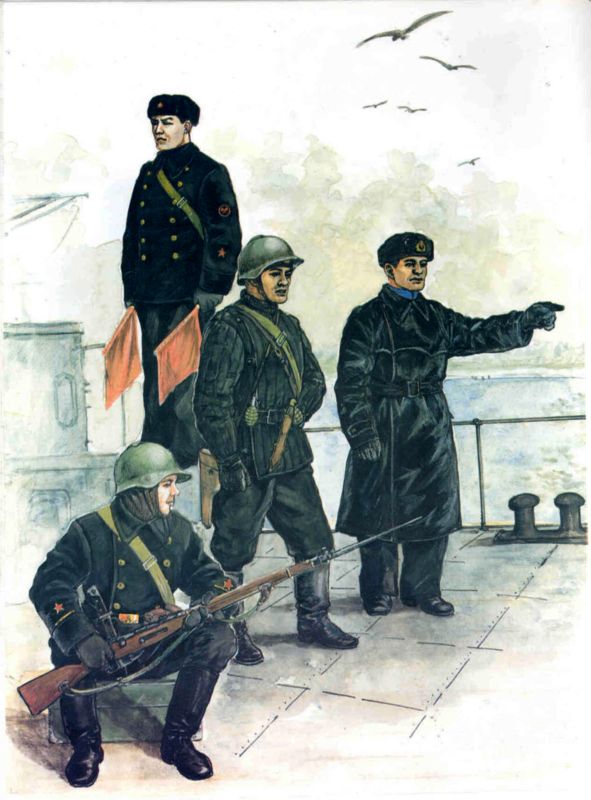 На переднем плане — старший краснофлотец в береговой десантной форме, снаряжении и вооружении. Каска обр, 1936 г. надета на вязаный подшлемник, брюки заправлены в яловые сапоги. Через плечо висит противогаз, бушлат подпоясан краснофлотским ремнем, на котором висят подсумки и клинковый штык. Вооружен трехлинейной винтовкой обр. 1891/30 с примкнутым четырехгранным штыком.