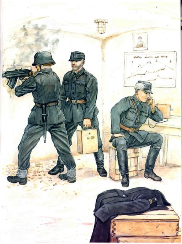 У телефона сидит лейтенант пехоты в зимнем кепи старого образца и кителе обр. 1936 г.