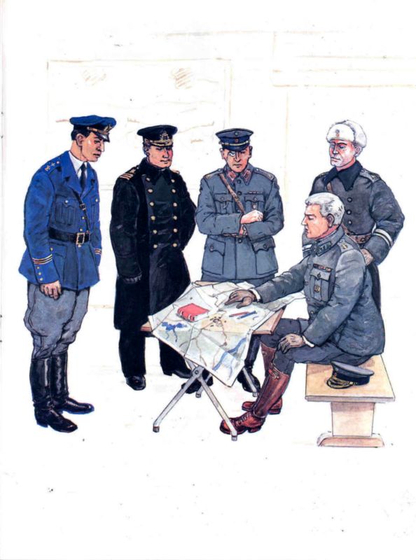 Финский офицер уполномоченный «шюцкора» в шинели и кепи и шведские лыжники-добровольцы в спортивной одежде.