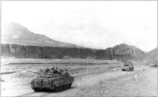 Разведчики 345-го опдп движутся на операцию в «зеленке» Баграма. Отличительной чертой их машин была четырехлучевая звезда в белом круге. На броню в поход навьючено все необходимое — запчасти, дополнительный боекомплект, спальные мешки, одеяла, инструменты и канистры с водой.