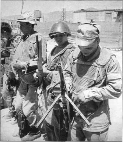 Проверка оружия перед выходом. Каждый имел свой автомат или пулемет, пристрелянный и самостоятельно подогнанный для ношения и стрельбы. Несмотря на штатное расписание, разведчики пользовались известной самостоятельностью в выборе оружия и возможностями подобрать себе подходящее. Многие предпочитали АКМ за возможность пополнять боезапас трофейными патронами.