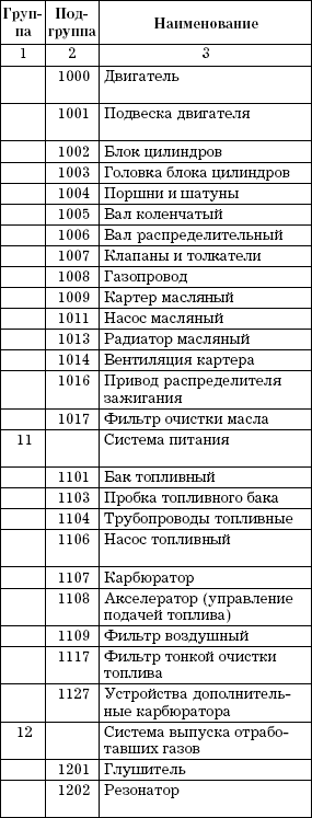 Чтобы найти номер нужной детали, следует по ее функциональной принадлежности определить по указателю групп и подгрупп (см. табл. 3), к какой подгруппе она относится. В разделе “Узлы и детали” на рисунке, относящемся к данной группе или подгруппе, найти деталь, (по внешнему виду и месту ее расположения в узле), а затем по номеру рисунка и номеру позиции найти строку в тексте, где помещены обозначение и наименование данной детали. В каталогах, издаваемых в последние годы, номера деталей указываются сразу на рисунках.