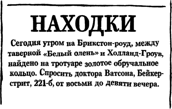 — Вот ваше кольцо, миссис Сойер, — прервал я ее излияния, повинуясь знаку Холмса. — Оно, безусловно, принадлежит вашей дочери, и я рад вернуть его законной владелице.