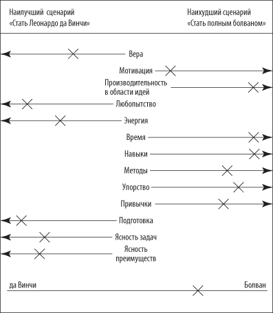 Конкретная ценность такого анализа обусловливается тем, как все факторы будут нанесены на диаграмму и подвергнуты оценке. В нашем примере крестик на прямой от «да Винчи» к «полному болвану» движется в сторону болвана. Факторы, связанные с конкретными навыками мышления, изобретением идей и методами, близки к наихудшему сценарию. Со временем динамическая природа этих факторов даст понять, что на пути к наилучшему сценарию нужно предпринимать активные мыслительные усилия и действия, чтобы повернуть вспять отрицательные силы. Например, чтобы существенно усилить творческое мышление (перенести крестик ближе к наилучшему сценарию), можно записаться на одноименный курс в местном колледже, посещать открытые семинары по креативности, попросить руководство пригласить эксперта по творческому мышлению для проведения мастер-классов на работе для всех желающих сотрудников.