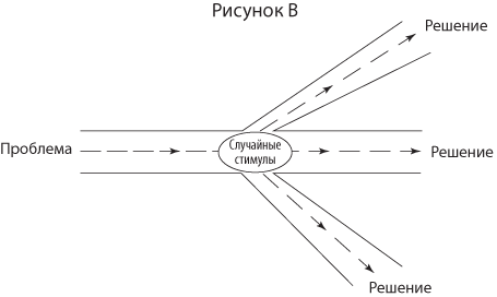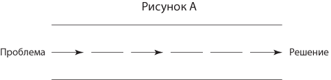 Эти стратегии высвобождают вашу творческую натуру, ломают укоренившиеся шаблоны и стимулируют появление новых, внедряя недоступную до сих пор информацию. Рисунок А иллюстрирует привычный шаблон мышления, при котором мысль линейно движется от проблемы к решению. Так нас учили думать. Сталкиваясь с проблемой, мы аналитически выбираем наиболее многообещающий подход, основываясь на прошлом опыте в жизни, на работе и в образовании, исключаем все остальные подходы и работаем в четко определенном направлении, приходя к правдоподобному решению.