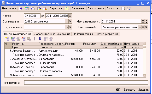 При проведении документа (кнопка «ОК») все денежные суммы, представленные в документы, регистрируются в информационной базе как произведенные начисления.
