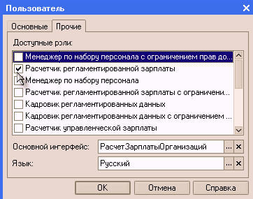 На закладке «Прочие» указываются роли, которые будут доступны пользователю при работе с прикладным решением, а также основной интерфейс и язык, на котором будут отображаться надписи, содержащиеся в интерфейсе прикладного решения: