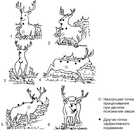 Наилучшие точки прицеливания при различных положениях зверя (рис. 2.1)