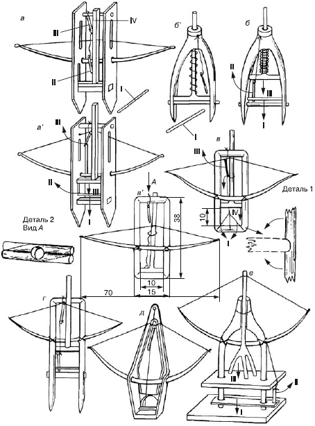 Черкан на рис. 2.5, г также сделан на основе рамки, загнутой из целого прута. Отличается эта рамка тем, что свободные ее концы скреплены порожком, заострены и опущены вниз. Воткнутые в снег или в землю, они придают черкану нужную устойчивость. Лук привязывают к рамке прочно шнуром или проволокой, так как давящий стержень никаких направляющих и точек опоры не имеет. В остальном настораживание и срабатывание этого самолова такое же, как у предыдущего.