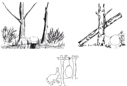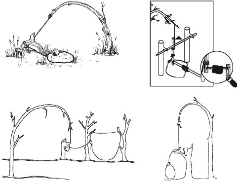 Расстораживать шатер может ловец из укрытия, сдергивая насторожку с помощью привязанного к ней длинного шнура (рис. 2.11, а).