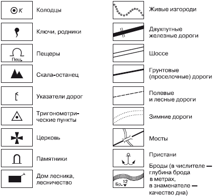 Линейные знаки (разновидность масштабных условных знаков) применяются при изображении объектов линейного характера – дорог, линий электропередачи, границ и т. п. Местоположение и плановое очертание оси линейного объекта изображаются на карте точно, но их ширина значительно преувеличивается. Например, условный знак шоссе на картах масштаба 1:100 000 преувеличивает его ширину в 8–10 раз. Внемасштабные условные знаки используются при изображении объектов, плановое очертание которых не может быть передано в масштабе карты. Местоположение таких объектов определяется главной точкой условного знака. Главными точками могут быть: геометрический центр фигуры, середина основания знака, вершина прямого угла или геометрический центр нижней фигуры. Пояснительные условные знаки применяются для дополнительной характеристики объектов местности, например, стрелка на реке обозначает направление течения и т. п.