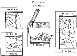 При склеивании карты кладут обрезанный лист оборотной стороной на смежный необрезанный и, сблизив их по линии склейки, наносят кистью на полосу склейки тонкий равномерный слой клея. Затем, перевернув верхний лист, совмещают рамки листов, километровые линии и соответствующие контуры. Место склейки протирают сухой тряпкой (бумагой), делая движение поперек линии склейки в сторону обреза. Небольшое несовмещение может быть исправлено протиранием в направлении, противоположном направлению смещения. Таким же порядком производится склейка рядов или колонн.