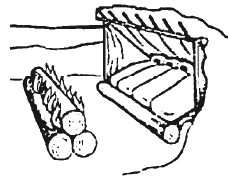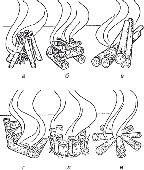 Костер в малолесной местности требует экономии дров и максимально бережного отношения к растительности. В степи для костра делают очаги из дерна, в горах – из камней (рис. 7.5). При укладке очага следует помнить, что можно добиться лучшего горения, если расстояние между боковыми стенками очага с наветренной стороны делать шире, чем с подветренной.