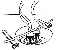На глубоком снегу и при наличии бросовых сырых или гнилых бревен лучше не рыть костровую яму, а разводить огонь на специальном помосте. Помост укладывается из нескольких сырых бревен, под которые для большей устойчивости следует положить еще две поперечные валежины.