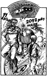 Коля відскочив убік і побачив, що його наздоганяє чудний дідусь. Дідусь їхав на одноколісному велосипеді, розвівши руки для рівноваги, ніби цирковий акробат. Він і зодягнений був, як акробат: у зелене трико, що облягало тіло, й червоні м’які тапочки з довгими, гострими, навіть трохи звислими вниз носками. У дідуся був сивий чуб їжаком і довгі вуса, теж розведені, — мабуть, для рівноваги.
