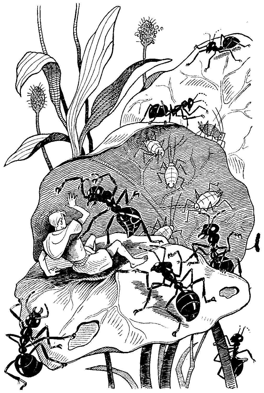 Темна мурашка швидко перебігала від однієї попелиці до іншої і дуже обережно торкала своїми вусиками кругле черевце то тієї, то тієї зеленої гладкої худобинки. Та трохи підводилась. На задньому кінці черевця виступала, виблискуючи на сонці, кругла краплина прозорої рідини. Мурашка жадібно ковтала ці краплини. Ось вона, очевидно, наїлася. Обережно перейшла з листка на стовбур, а, з стовбура почала спритно спускатися на землю. Я звісив голову з свого листка і дивився їй услід. Побачив, як її перейняла друга мурашка. Вона дотиком своїх вусиків зупинила першу мурашку. Сита мурашка присіла на задні ніжки і, витягнувши голову вперед, випустила з рота краплину сиропу. Голодна потяглася до ситої. — частина сиропу перейшла до голодної. Сюди вже поспішали інші мурашки, і перша мурашка, яка погостювала у попелиць, почала “видавати” кожній з них потроху сиропу.