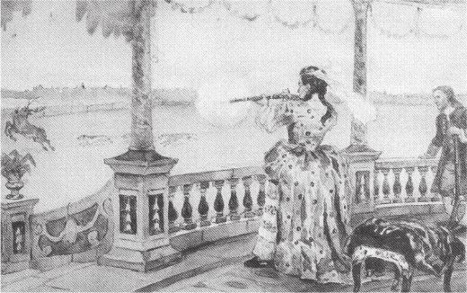 Стрельба из ружья благодаря столь сильной страсти царицы становилась в обществе модой. Раболепствующая знать приучала своих юных дочерей палить по голубям, а Анна Иоанновна ревниво вопрошала московскую гостью: «Стреляют ли дамы в Москве?» – и та уверяла, что стреляют, матушка, стреляют! А как же иначе! Купалась бы государыня в проруби, и все юные и не очень графини и княжны лезли бы в ледяную воду, дабы угодить коронованной наяде. Такое пристрастие к охоте и стрельбе, конечно, очень выразительно. Для подвигов Петергофской Диане требовались твердая рука, точный глаз, сила телесная, хладнокровие и азарт. Вероятно, этот комплекс амазонки как нельзя лучше соответствовал внутреннему миру императрицы, устройству ее души, далекой от интеллектуальных поисков. Впрочем, чтобы не толкать читателя на путь сомнительных выводов, скажем, что, как бы велика ни была страсть Анны Иоанновны к охоте, она не могла вытеснить другой, главной ее страсти. Объектом ее был мужчина – Бирон.