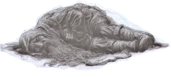 Коли ґноми підбігли до берега, у воді ще було видно Бомбурів каптур. Вони миттю кинули побратимові мотузку з гаком. Бомбур ухопився за неї – і вони витягли його на сухе. Звісно, він був мокрий з голови до ніг, але то було не найгірше. Коли вони поклали його на берег, він уже міцно спав, стискаючи в руці мотузку, та так сильно, що йому не могли розтиснути кулак, — і ґном продовжував міцно спати, хоч як вони силкувалися його розбудити.