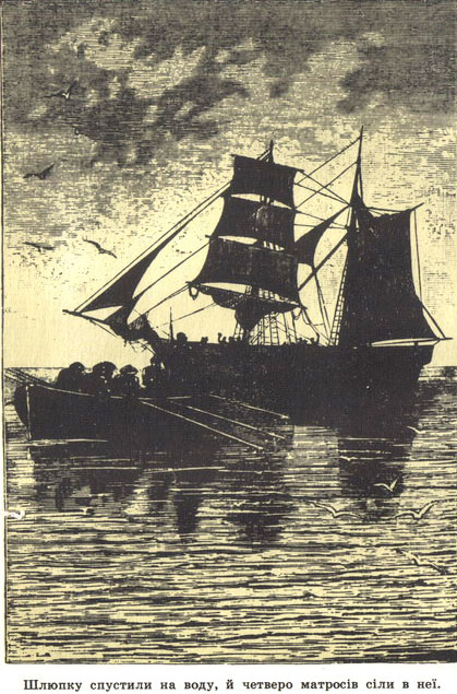 Шлюпку з штирборту спустили на воду, й четверо матросів сіли в неї.