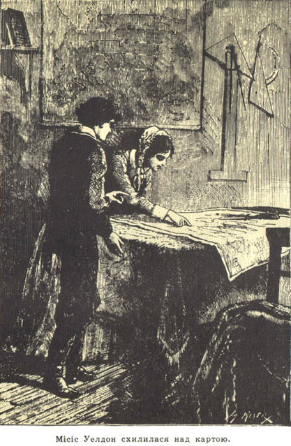 Місіс Уелдон схилилася над картою. Вона вдивлялася в коричневу пляму, що нею позначено землю, праворуч од цього широкого океану. То був берег Південної Америки, велетенський бар'єр між Тихим і Атлантичним океанами — від мису Горн аж до берегів Колумбії. Розглядаючи, отак як вона, недосвідченими очима карту, де вміщався цілий океан, можна було подумати, що берег зовсім недалечко й довезти туди пасажирів на «Пілігримі» — легка й незабарна справа. Ця ілюзія незмінно виникає у кожного, хто незнайомий з масштабами морських карт. Місіс Уелдон і справді здавалося, що до землі рукою подати, як і на оцьому клапті паперу.