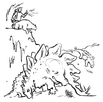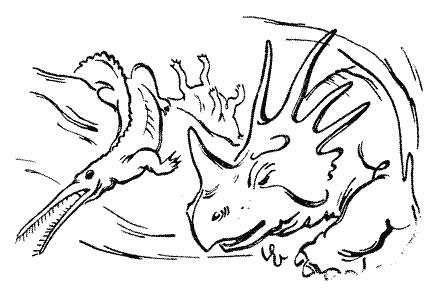З руїн третього, вузенького темного коридора виднілася чудернацька голова ігуанадона з довгою, витягнутою вперед м'язистою шиєю. Ця тварина, певно, була предком крокодила. Озброєна вона не лише страшними зубами, але й двома прямими рогами на лобі.