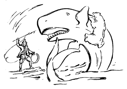 Перелякана кит-самка подалася в сховище, але хижак помчав за нею через тунелі в скелях і через печери льодових гір. Тепер вони зустрілися в цьому озері, борючись не на життя, а на смерть. Кит від страху хропів, сопів, видував пару з ніздрів. Він зайняв зручне для боротьби місце — велику голову сховав у вузеньку бухту, до якої ворог не мав доступу. Єдиним засобом захисту кита є його хвіст. Правда, цей хвіст — страшенна зброя. Китолови розповідають, скільки всякого лиха може заподіяти кит своїм хвостом. Підкине шлюпку разом з дванадцятьма матросами в повітря, одним помахом хвоста розсіче пором надвоє так, наче б його пилою розпиляли.