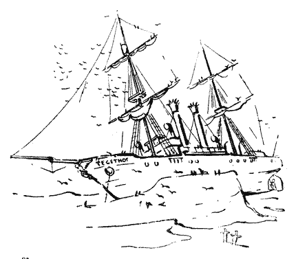 Коли я знову потрапив на палубу «Тегетгофа», то, припавши до неї, цілував її, немов знайшов свій рідний край. Я обіймав щогли, труби, немов рідних братів.