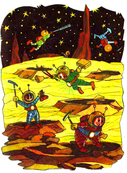 — Що ж трапилось? — розгублено бурмотів Знайко. — Одне з двох: або вичерпалась енергія, випромінювана місячним каменем…