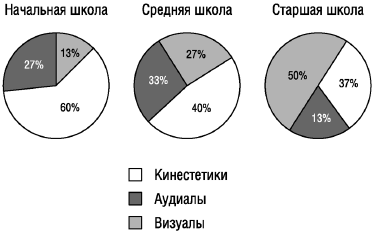 Вся система обучения работает на визуалов. Поэтому среди детей, успевающих на «хорошо» и «отлично», в школьной эволюции увеличивается процент визуалов. Среди учеников средней школы и старшеклассников неуспевающими оказываются многие кинестетики.