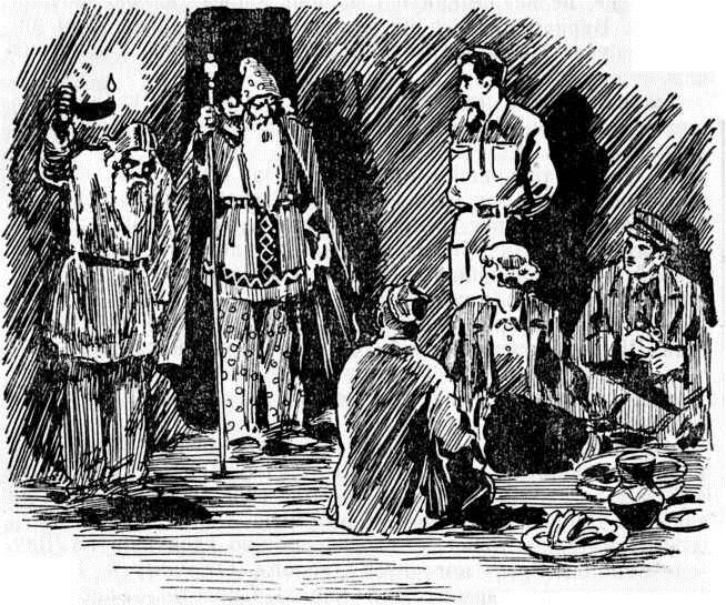 Віщун стояв у владній, упевненій позі. Але ось він ледве помітно махнув рукою. До намету шмигнула маленька чорнява людинка. Вона низько вклонилася віщунові і стала поруч нього, з цікавістю розглядаючи полонених. Біля входу ще стояли якісь темні фігури.