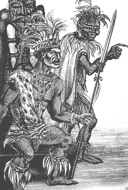 Пройшовши кількасот ярдів, ми опинилися біля огорожі, схожої на ту, яка оточувала наші хатини, але разів у п’ятдесят довшої, оскільки вона відокремлювала не менше шести чи семи акрів землі. При огорожі тяглася вервечка хатин, в яких жили дружини короля. Якраз навпроти головних воріт, в глибині величезної площі, стояла осібно досить велика споруда, — це була резиденція його величності. Всю решту площі заповнювали численні загони воїнів. їх було не менше семи-восьми тисяч. Коли ми проходили повз них, вони стояли незворушно, немов статуї. Важко передати словами, яким величним видовищем були ці війська, з пишними плюмажами, блискучими списами і залізними щитами, обтягнутими буйволовими шкурами. На вільній частині площі перед королівською будівлею стояло декілька помостів. Три з них ми зайняли за вказівкою Інфадуса, Амбопа став позаду нас, а сам Інфадус залишився при вході до житла короля.