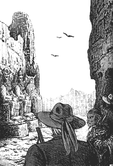 Там, на колосальних п’єдесталах із темної скелі, на відстані двадцяти кроків одна від одної, споглядаючи дорогу, що тяглася на шістдесят миль до Луу, сиділи три колосальні постаті — дві чоловічі й одна жіноча. Кожна з них була близько вісімнадцяти футів заввишки від тімені до п’єдесталу.