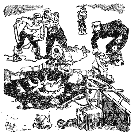 Розкинули льодовий табір під торосом. Ждемо, коли лід зійдеться. Так би воно нічого, поспішати нам особливо нікуди, й з харчуванням благополучно: в дорозі ми запаслися пеміканом, рибою, мороженими рябчиками. Ну, знову ж, і від корови молочко. Словом, з голоду не загинули б, а от з холодом сутужно прийшлося. Сидимо, притулилися один до одного, тремтимо. Особливо Фукс страждав: борода в нього обмерзла, вся в бурульках, ниє хлопець, нарікає. Лом теж тримається з останніх сил… Так…
