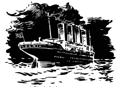 Лайтолдер підскочив до поручнів. За неспокійною смугою туману він помітив якийсь блиск. Спочатку це була тільки цятка. Ходовий вогонь? Невже ще якесь судно прямує курсом «Титаніка?» Але ні! Блискуча цятка збільшувалася надзвичайно швидко. Вона була прямо перед судном, що мчало вперед! І ось уже в тумані з'явилася гора зеленкуватої криги. Над її химерними зубцями й шпилями клубочився туман. Обриси вершини губилися в темряві нічного неба. Крижаний колос піднімався з чорних океанських хвиль більше ніж на тридцять метрів угору.