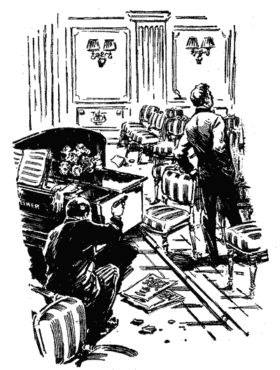 Але відповіді не було. З досадою грюкнувши дверима, Томпсон підійшов до крісел і зазирнув між рядами. Дуло пістолета повернулося слідом за ним. Усе ближче підходив Томпсон до рояля. Став перед кріслами, похитав головою. Він міг би заприсягтися, що негідник заховався десь тут. Інтуїція підказувала йому, що в залі хтось є.