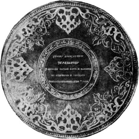 Фиг. 2. Серебряная ваза, украшенная орнаментом и турмалинами, отлитая в честь Е. А. Черепанова. На вазе надпись: «Ефиму Алексеевичу Черепанову. Устроение первой паровой машины на рудниках и заводах Нижне-Тагильских 1824-го года».