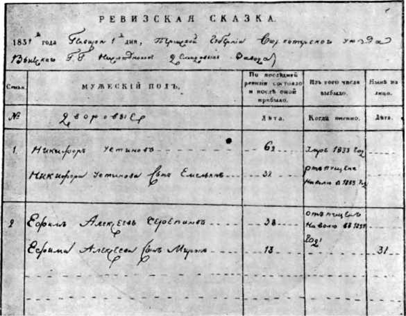 Фиг. 3. Ревизская сказка 1834 г. с данными о Е. А. Черепанове и М. Е. Черепанове.