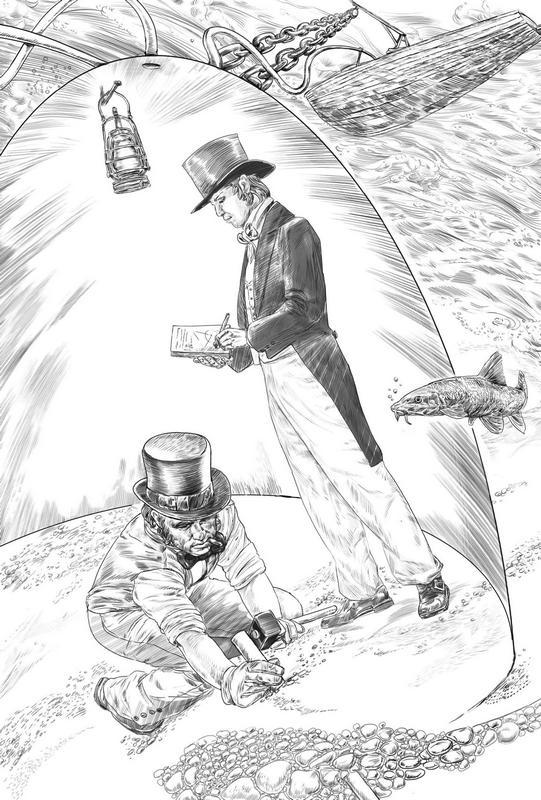 Я предложил провести серьезное обследование дна. На барже доставили водолазный колокол и приготовили к спуску над тем местом, где в туннеле находится наш щит. Мы с Граваттом опустились в воду на 30 футов. И что же? На дне мы обнаружили ровно то же самое, что просыпалось к нам в туннель – кости и фарфор. Стоя в колоколе, я забил в дно реки кол. Вернувшись, мы узнали, что Нельсон, работавший в своей ячейке, слышал удары, и когда сообщил о них, это вызвало всеобщую панику: должно быть, рабочие решили, что к ним пробивается сам Водяной.