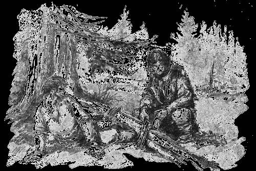 Оставив свое убежище под лиственницей, Тумоуль пополз по направлению к речке, выбирая более открытые места, чтобы не цепляться колодками за деревья. Вдруг он остановился — его ухо уловило хруст ветвей. Подняв голову, он стал всматриваться в лесную чащу. Вот что-то темное мелькнуло за деревьями, и через миг лохматое, одетое в звериные шкуры существо появилось около Тумоуля. Это был сумасшедший Джероуль. Не пришел ли он посмотреть, какие знаки вырезал на стволах Тумоуль?