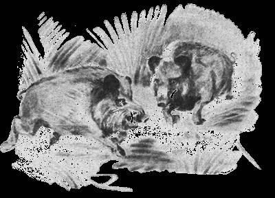 Как-то Дун засел с подветренной стороны около кабаньей стоянки. Счастливый его соперник находился, видимо, в самом благодушном настроении. Он гонялся за любимыми веприцами, игриво толкал их боками, в шутку наставлял на них клыки.