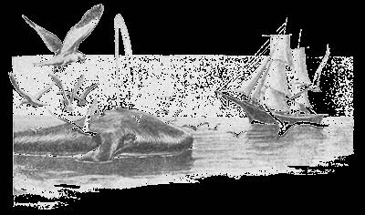 Шхуна тихо скользит. Впереди, мирно покачиваясь на волнах, распласталась грузная туша кита. Словно греясь в млеющей над океаном солнечной мари, крутым завалом поднялась спина животного. Над нею с криком носятся чайки. Издалека видно, как слетаются они на темное пятно, соскучась по твердой почве, но, покружась, пугливо отлетают прочь от качающейся туши, и сильнее звучит их крик, похожий на плач ребенка…