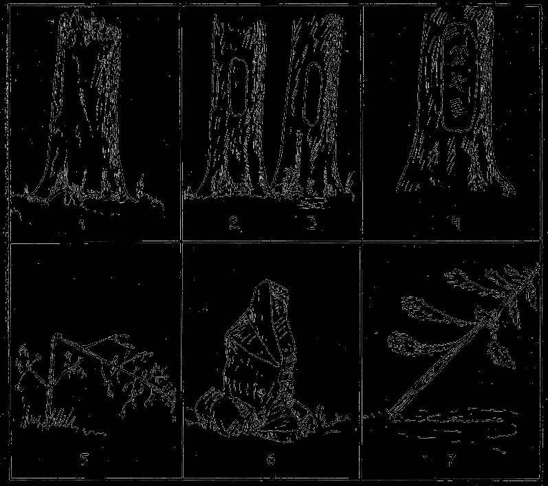 Знаки вогулов: 1. Затесы с обеих сторон дерева обозначают дорогу. 2. Поворот влево. 3. Поворот вправо. 4. Здесь ночевали двое вогулов, и с ними были две собаки. 5. Дорога, идет по направлению залома. 6. Каменная веха, обозначающая дорогу. 7. Дорога поворачивает по направлению наклона.