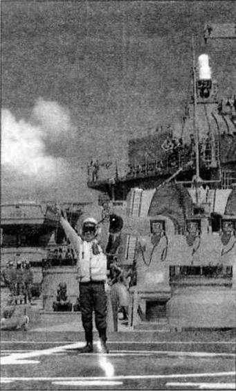 На кормовой палубе "Айовы". Взлет и посадка вертолета. Диспетчер дает указания на взлет и посадку. Позади него видны третья орудийная башня главного калибра, аппараты запуска "Томагавков", 20-мм спаренные зенитные системы и т. д.