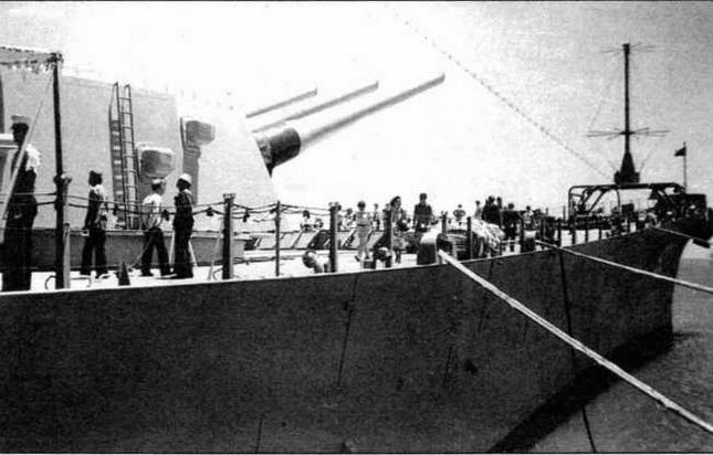 Линкор "Миссури ". Подготовка к приему на борт корабельного самолета, вернувшегося с разведки (фото из архива К.Золотова).