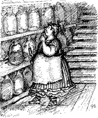 "Сколько ему нужно на этот раз, миссис Бин?" – крикнула кухарка, обращаясь к хозяйке, оставшейся наверху. – "Прихвати две или три банки", – донеслось оттуда.