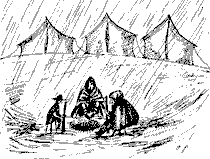 У входа в лисью нору сидели у своих палаток Боггиз, Бунс и Бин. На коленях у них лежали ружья. Шел дождь. Вода стекала фермерам за шиворот и заливалась в ботинки.