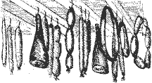 Стены необъятного помещения были забраны стеллажами от пола до потолка – а на стеллажах лежали тысячи и тысячи – самых лучших, самых жирных уток и гусаков – ощипанных и готовых к жарке. А под крышей, подвешенные к балкам, раскачивались сотни копченых окороков и колбас.