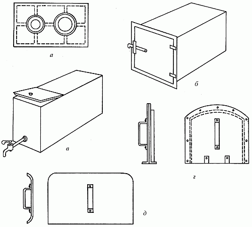 Рис. 10. Печные изделия: а – чугунный настил с конфорками; б – духовой шкаф; в – водогрейный бачок; г, д – заслоны