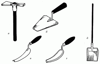 Рис. 11. Инструменты для печных работ: а – молоток-кирочка; б – кельма; в – расшивка для выпуклых швов; г – расшивка для вогнутых швов; д – растворная лопата